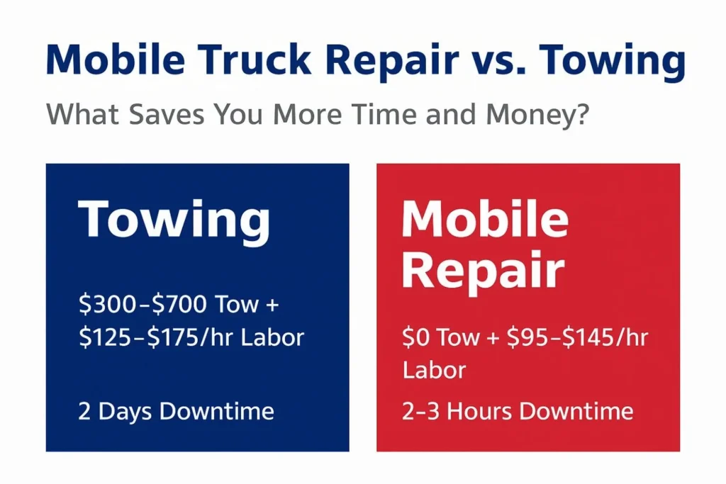 When your truck grinds to a halt on the side of the road, your first instinct might be to call a tow truck. But is that the smartest move? In the heat of a breakdown, the decision you make can have a major impact on your bottom line. Between traditional towing and mobile truck repair, one option often saves you significantly more time, money, and stress—especially when it’s not a major engine failure.