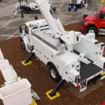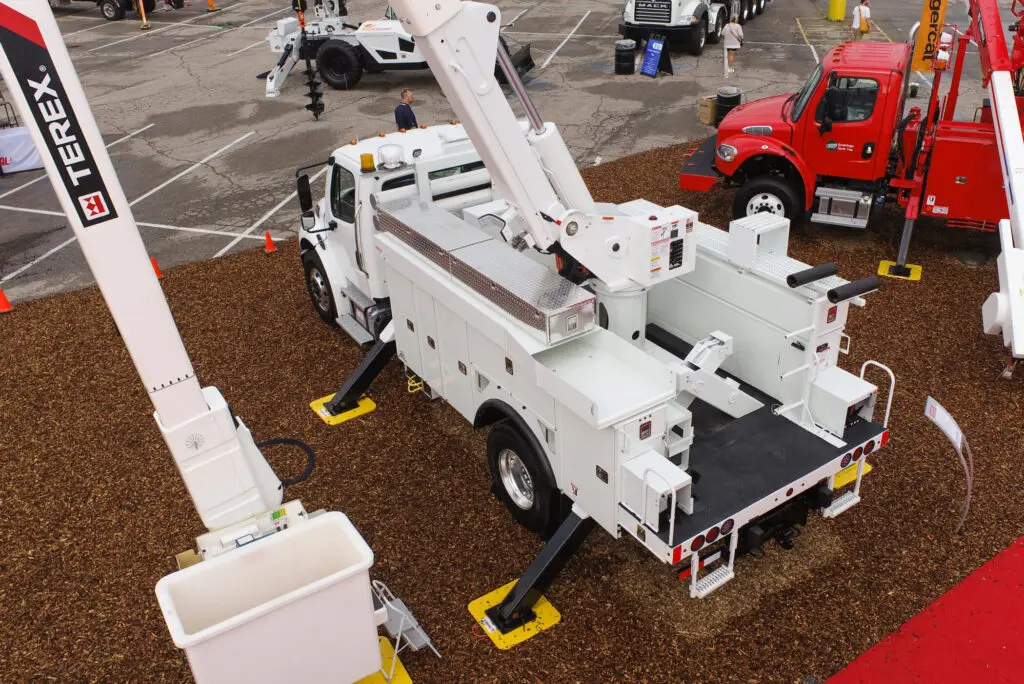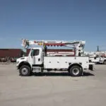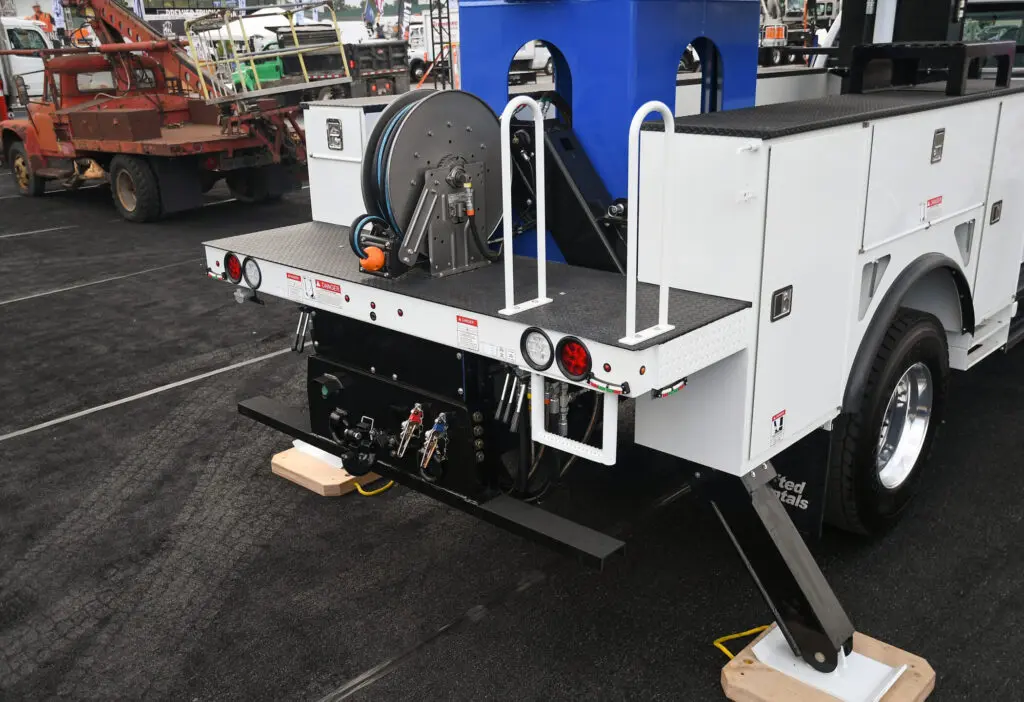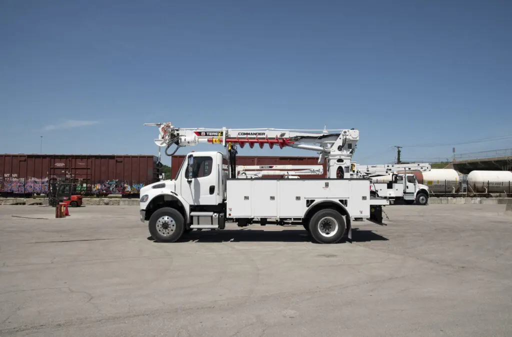 Line body trucks designed for electrical, telecom, and utility operations — offering secure, organized storage with open compartments and ladder racks.